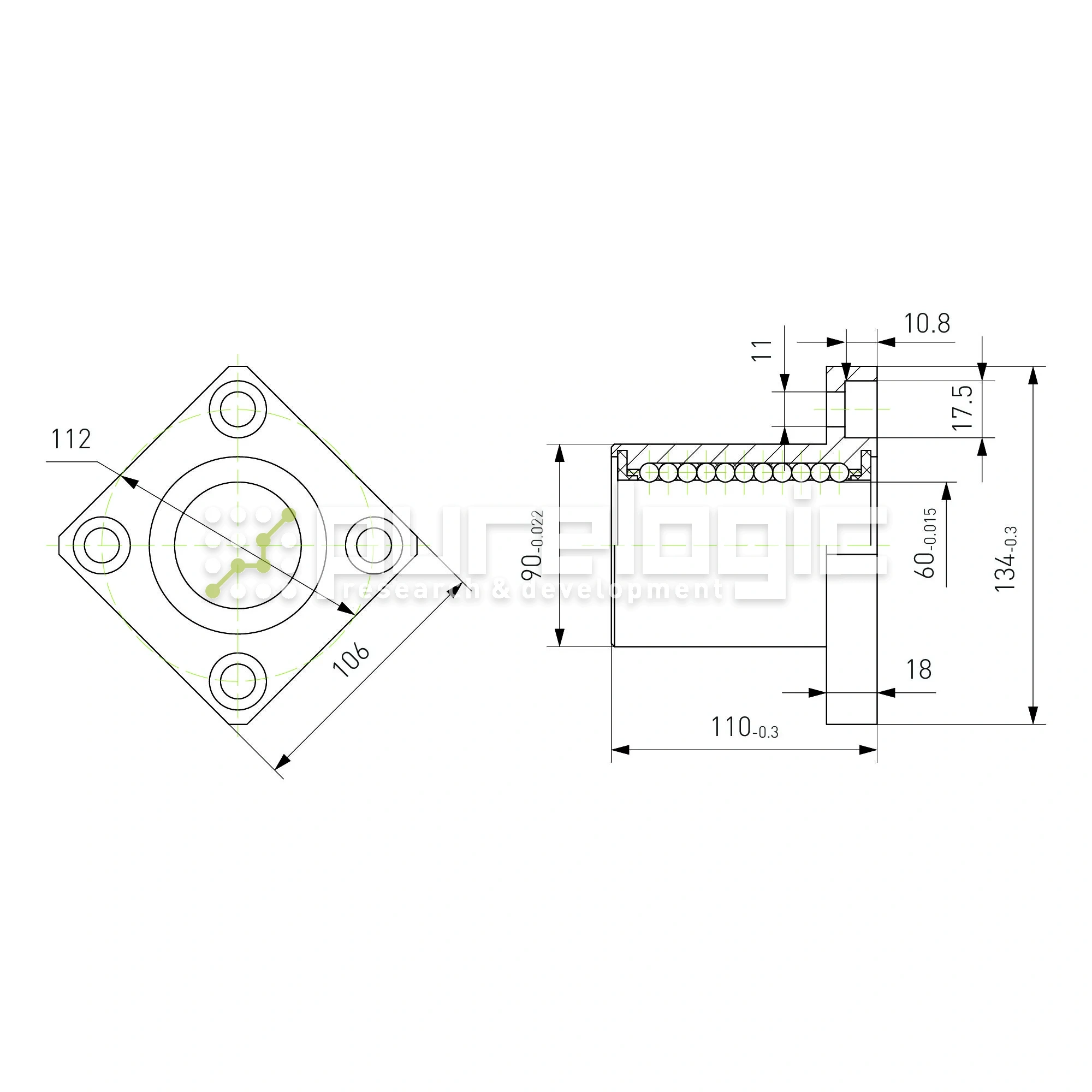 Линейный подшипник на вал Ø60мм. Квадратный фланец с краю.